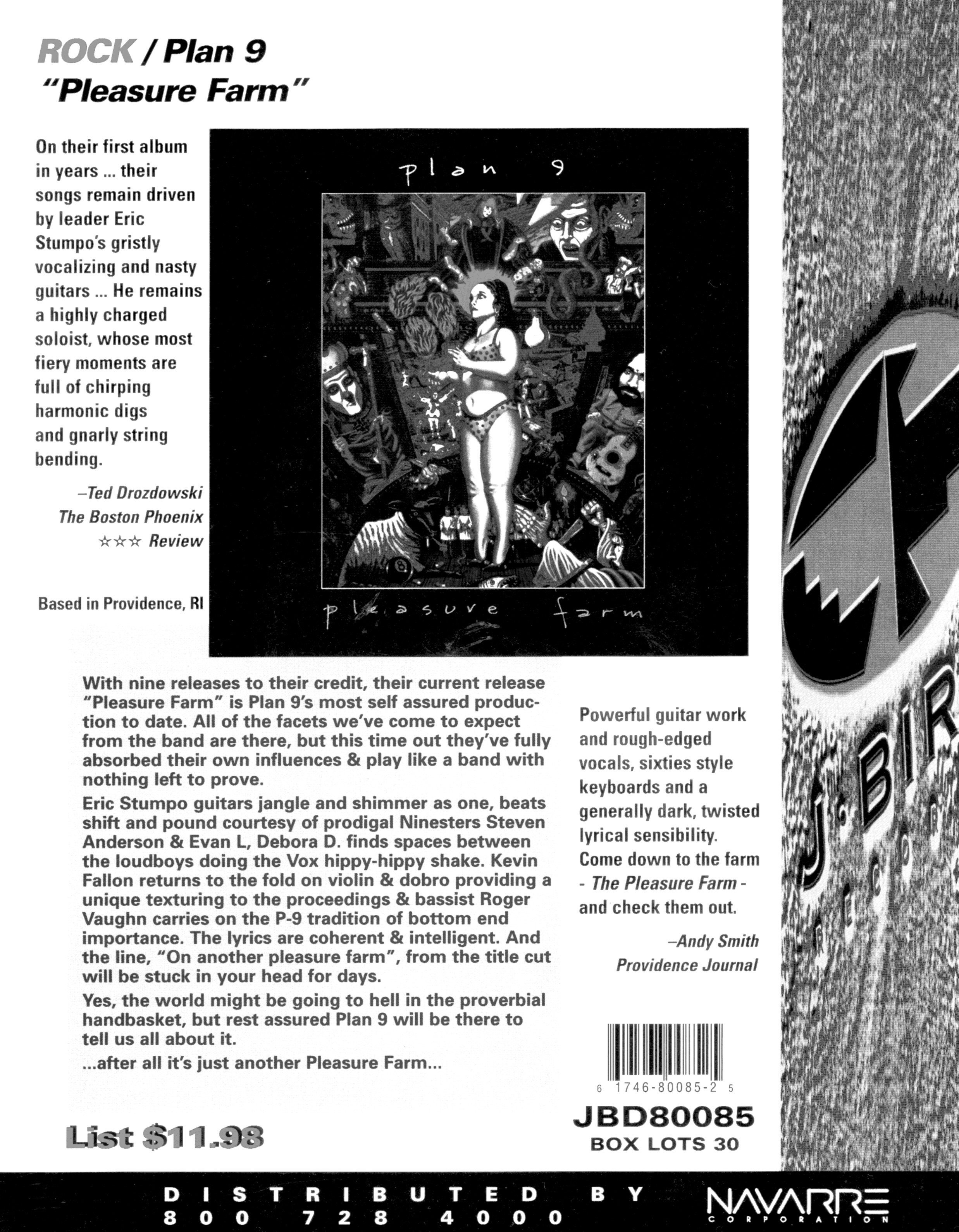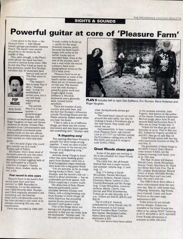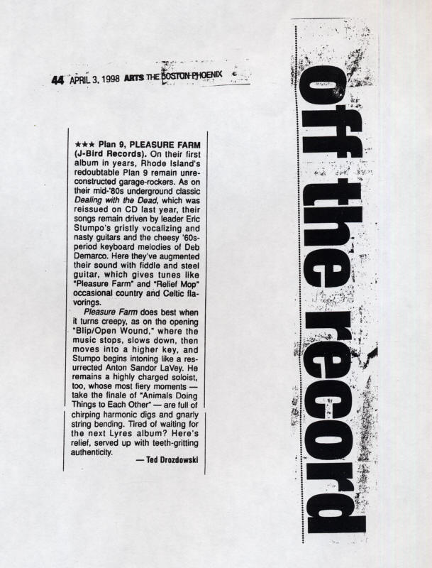 Powerful guitar work and rough-edged vocals, sixties style keyboards and a generally dark, twisted lyrical sensibility. Come down to the farm - The Pleasure Farm - and check them out Andy Smith Providence Journal